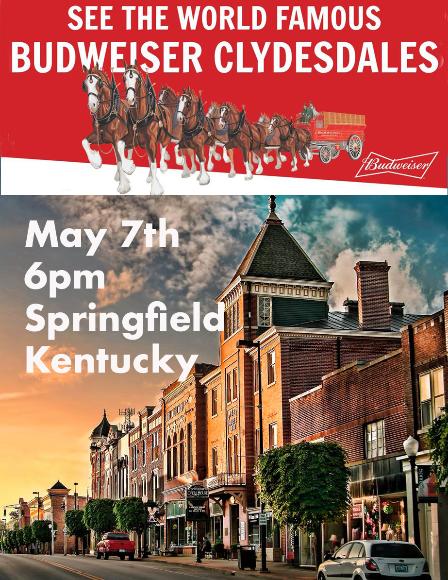 Springfield, Kentucky is beaming with pride that it has been selected for a Full-Hitch Parade with the World Famous Budweiser Clydesdales. On Thursday, May 7th, 2026 at 6 pm, Wildflower Ranch Inn welcomes the festivities surrounding these magnificent horses and their visitors.